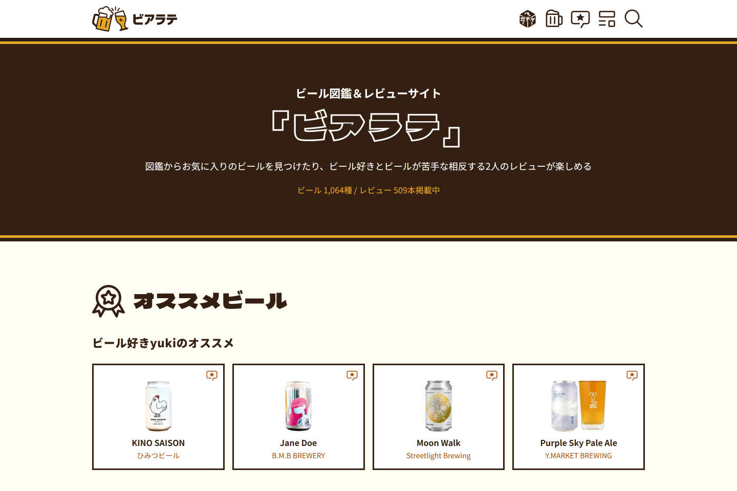 2人のレビュー合計点が9.5点以上の場合に掲載される、殿堂入りビールページを追加しました。